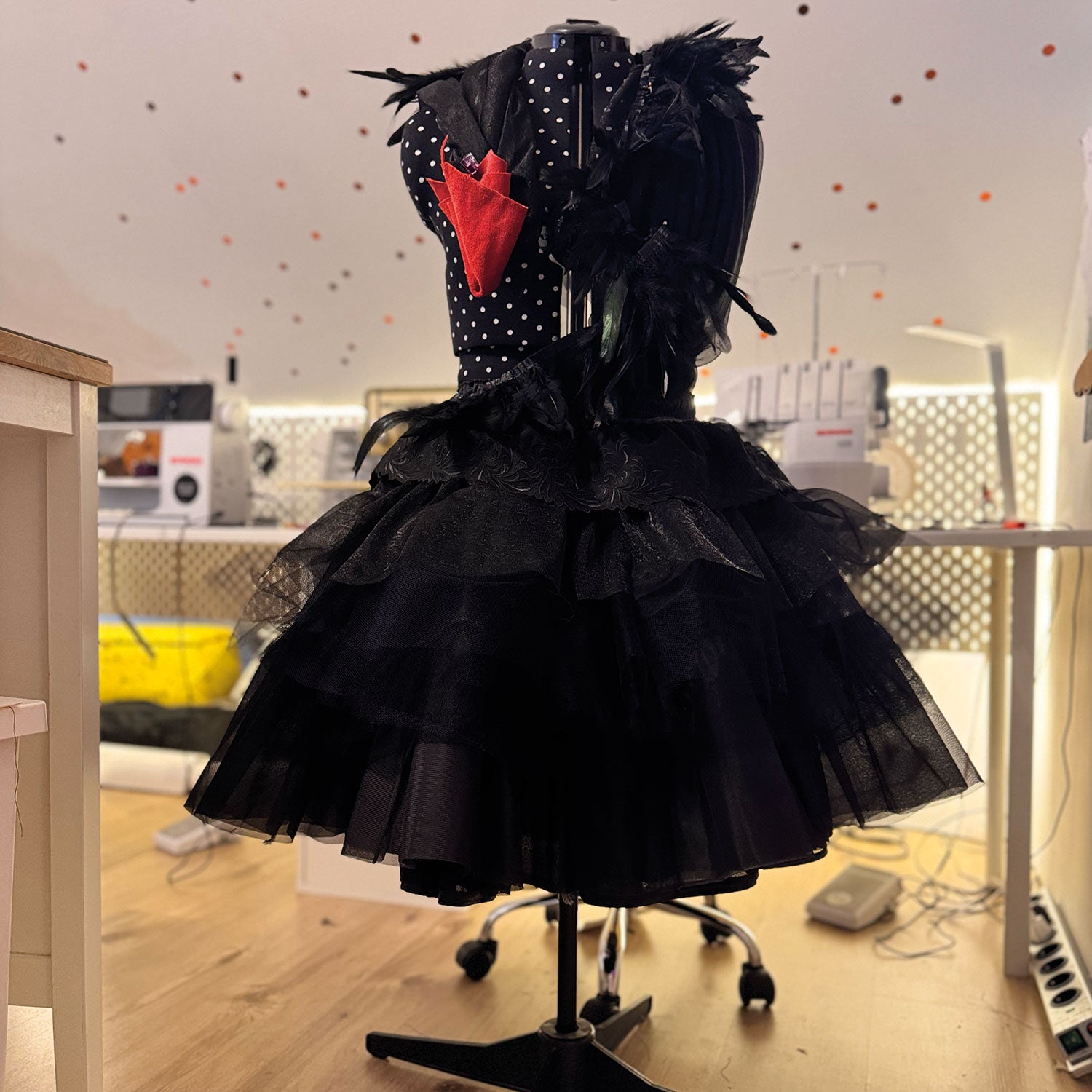 In Richtung Brust und Hals wechsele ich zu weicheren Materialien. Hier nutze ich Tüll – in unterschiedlichen Varianten – sowie Viskose, Spitze und Federn. Diese Materialien sorgen nicht nur für einen angenehmen Tragekomfort, sondern schaffen auch eine sanfte, harmonische Übergangswirkung. Die Kombination aus der Stabilität des Petticoatstoffs und den weichen, fließenden Materialien nach oben hin unterstreicht die Eleganz des Designs und sorgt für ein ausgewogenes Gesamtkonzept.