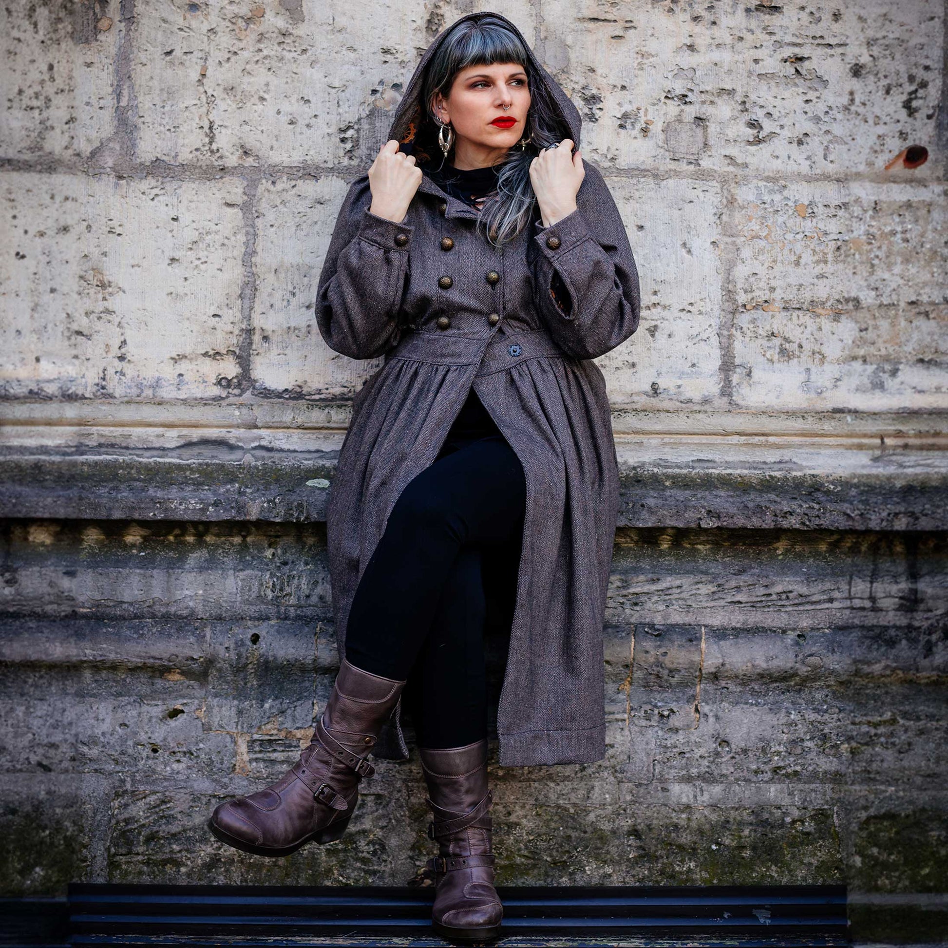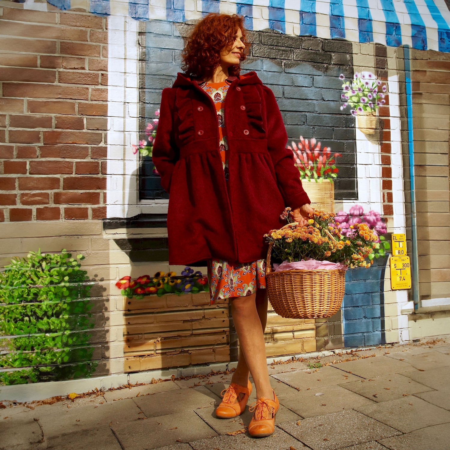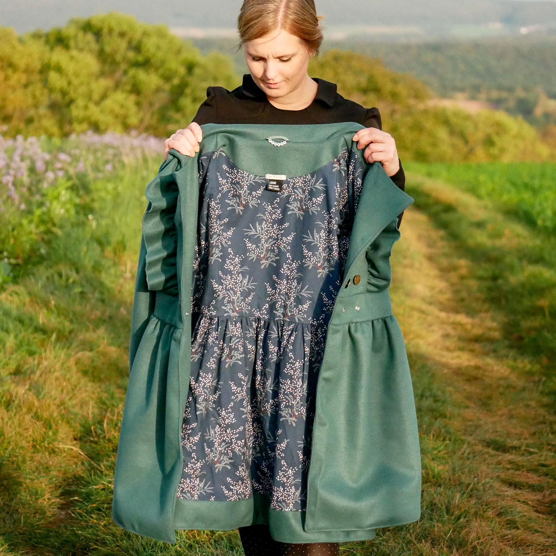 Grete ist ein liebevoller, solider & fachlich stimmiger Mantelschnitt der mit einigen Optionen kommt. Für den Vintageflair kannst du sie mit Rüschen & Kragen nähen oder im nordischen Stil etwas schlichter, dafür aber mit toller Kapuze windtauglich machen. Eine Pattentasche für geheime Schätze im Mantelinnern oder Veredelungen via selbstgerechter Papsel, korrektes Maßnehmen und Einzeichnen im Fadenlauf und Manschetten stehen ebenfalls auf dem Program. Aber keine Angst: du nähst nicht allein.