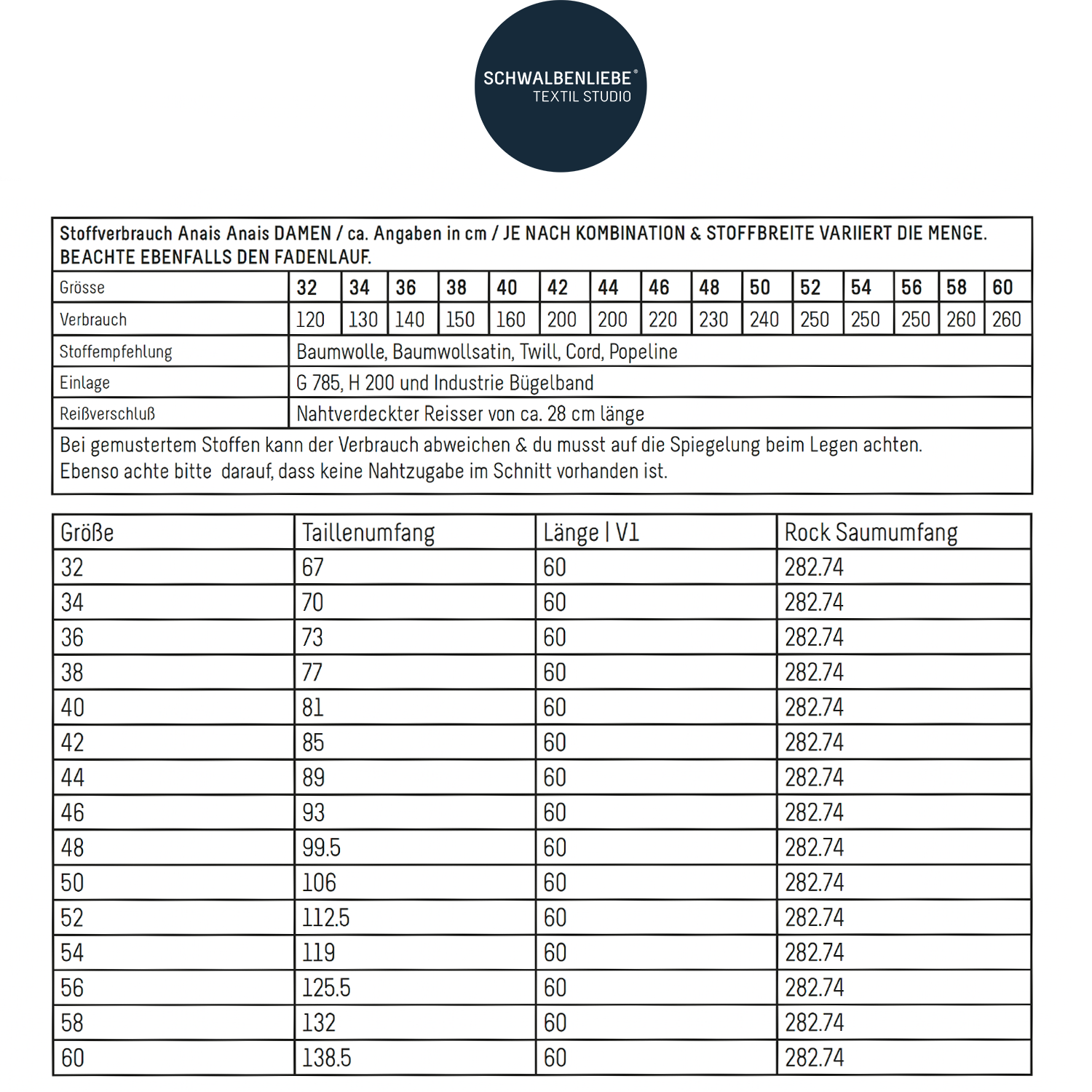 The well-thought-out design and the neatly finished waistband with a zipper demonstrate the high quality and fit of the vintage Anais skirt. The detailed and lovingly created eBook included in the package provides you with useful tips and suggestions for designing your new favorite skirt.